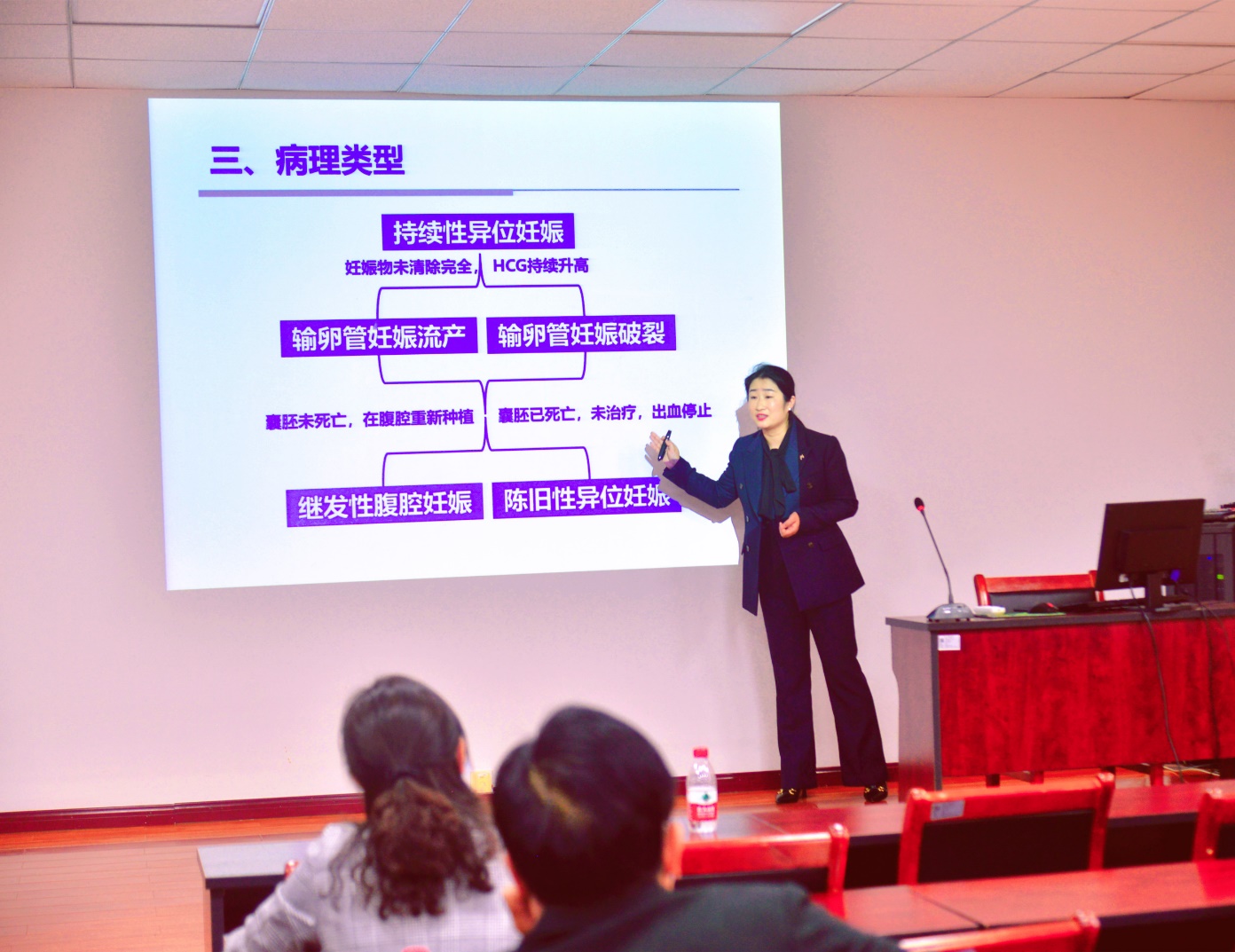 费杨老师主讲的内容是异位妊娠,她从一个病例开始讲授,从病例的临床症状,到理论探析,层次分明、重点突出、深入浅出的讲授了概念、临床表现、诊断依据等内容。庄重的仪态、自然的表情、标准的发音、精炼的语言,给老师们留下了深刻的印象。