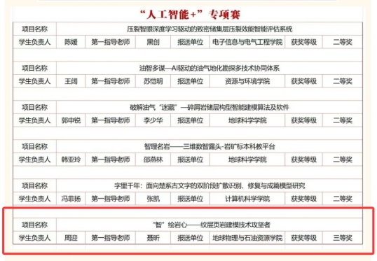 通讯员 刘筱蔓)近日,第十九届“挑战杯”全国大学生课外学术科技作品竞赛“人工智能+”专项赛结果揭晓。长江大学地球物理与石油资源学院博士生周迎领衔的团队,凭借参赛作品《“智”绘岩心——纹层页岩建模技术攻坚者》,荣获全国三等奖,为学校赢得荣誉。